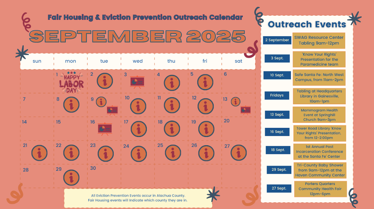 Know Your Rights Workshops - The Alachua County Eviction Prevention team is hosting FREE monthly legal clinics “Know Your Rights As A Renter” at public locations throughout the county. Join the Eviction Prevention team this month at the Tower Road Library Branch on September 16th from 12pm-2pm located at 3020 SW 75th St, Gainesville, FL 32608. Don’t miss this opportunity to hear advice and ask questions of experienced housing attorneys.
