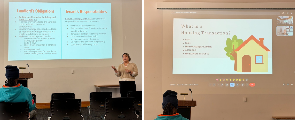 The Housing Justice team hosted a Know Your Tenant Rights presentation at the Tower Road Library Branch, where attorneys, Pablo and Rosemary, educated patrons on their tenant rights. The presentation provided valuable information on housing protections, eviction prevention, and fair housing laws, and offered attendees the opportunity to ask questions and connect with free legal resources.