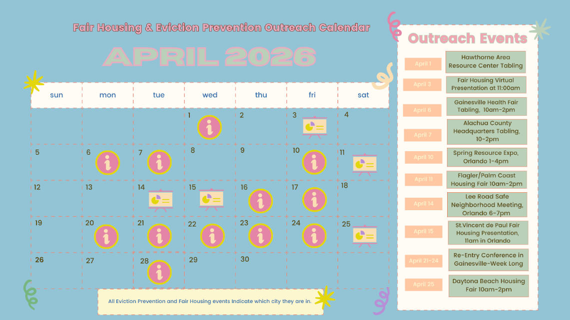If you or someone you know is facing discrimination on the basis of a protected class, or needs legal assistance navigating housing related issues, do not hesitate to give us a call at 407-801-4224 or email us at fairhousing@floridalegal.org